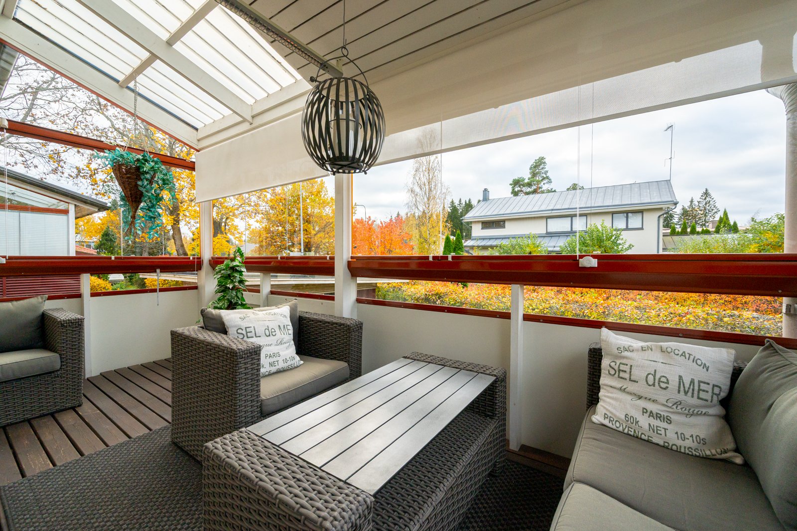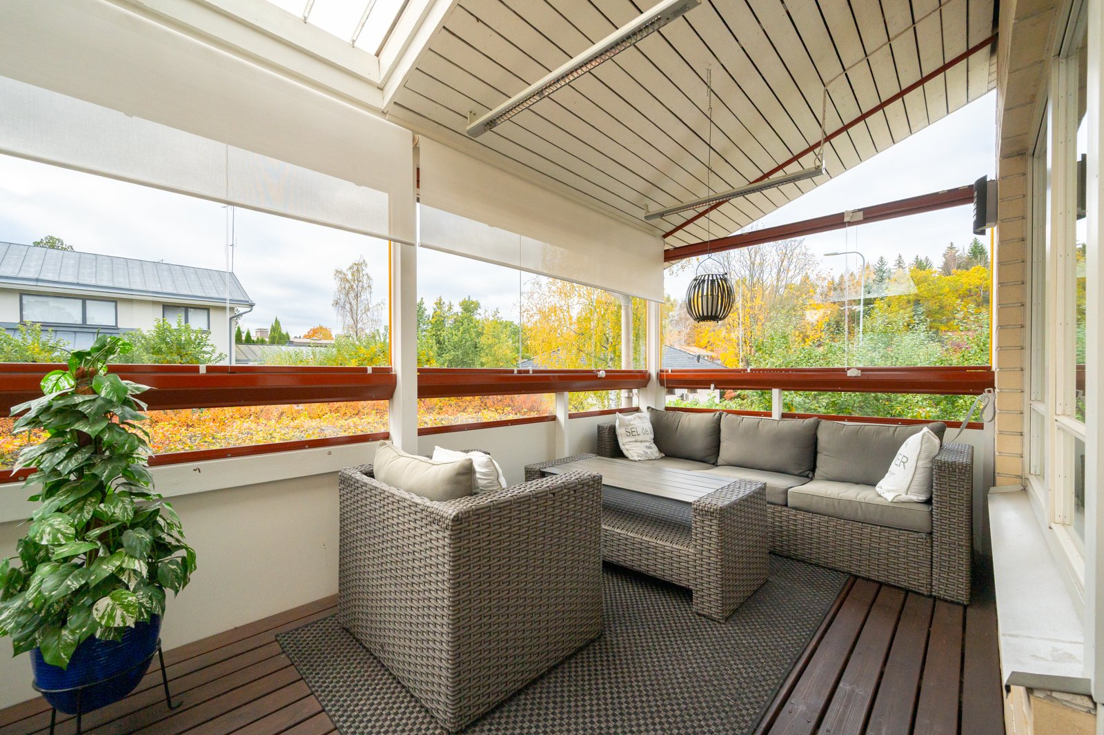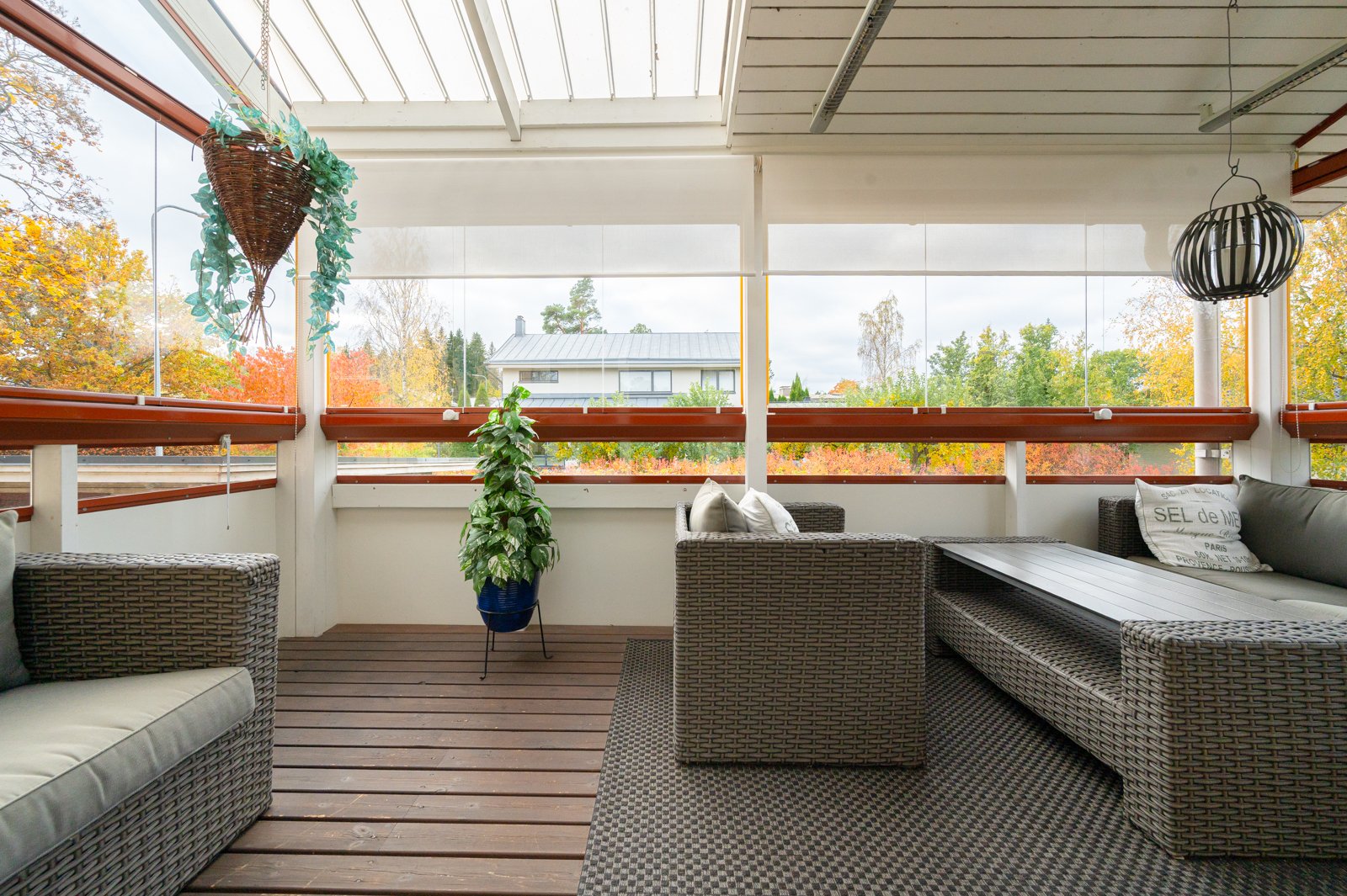 Parvekkeella Lumon Screen kangas verhot Artic kaihdin. Lautalattia. Infrapunalämmittimet katossa.