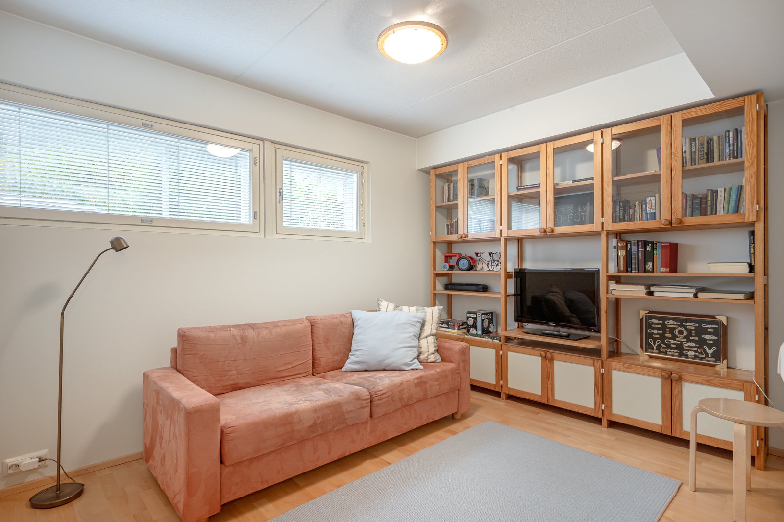 Alakerrassa on saunaosasto, askarteluhuone/vierashuone, vaatehuone, wc ja erittäin toimiva kodinhoitohuone. Alakerrasta pääsee ulos katettuun tilaan, jossa on ulkovarastot ja portaat omalle pihalle.