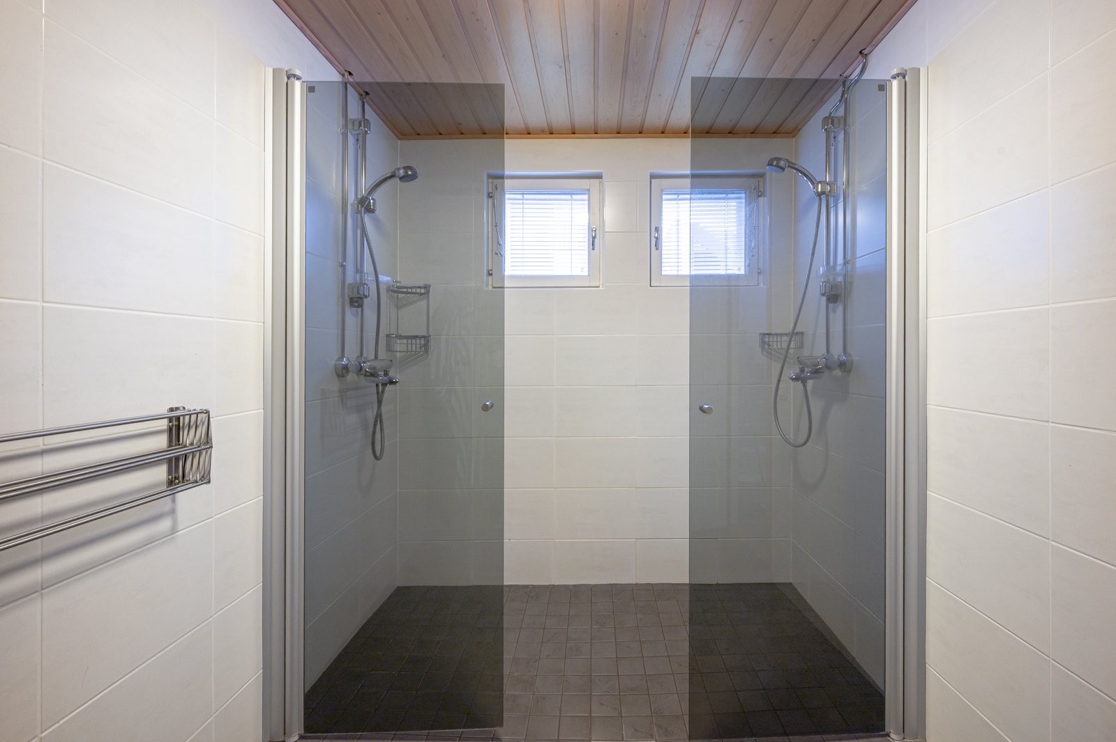 Ikkunallinen iso kylpyhuone saunan yhteydessä. 2x suihku ja lasiovet.