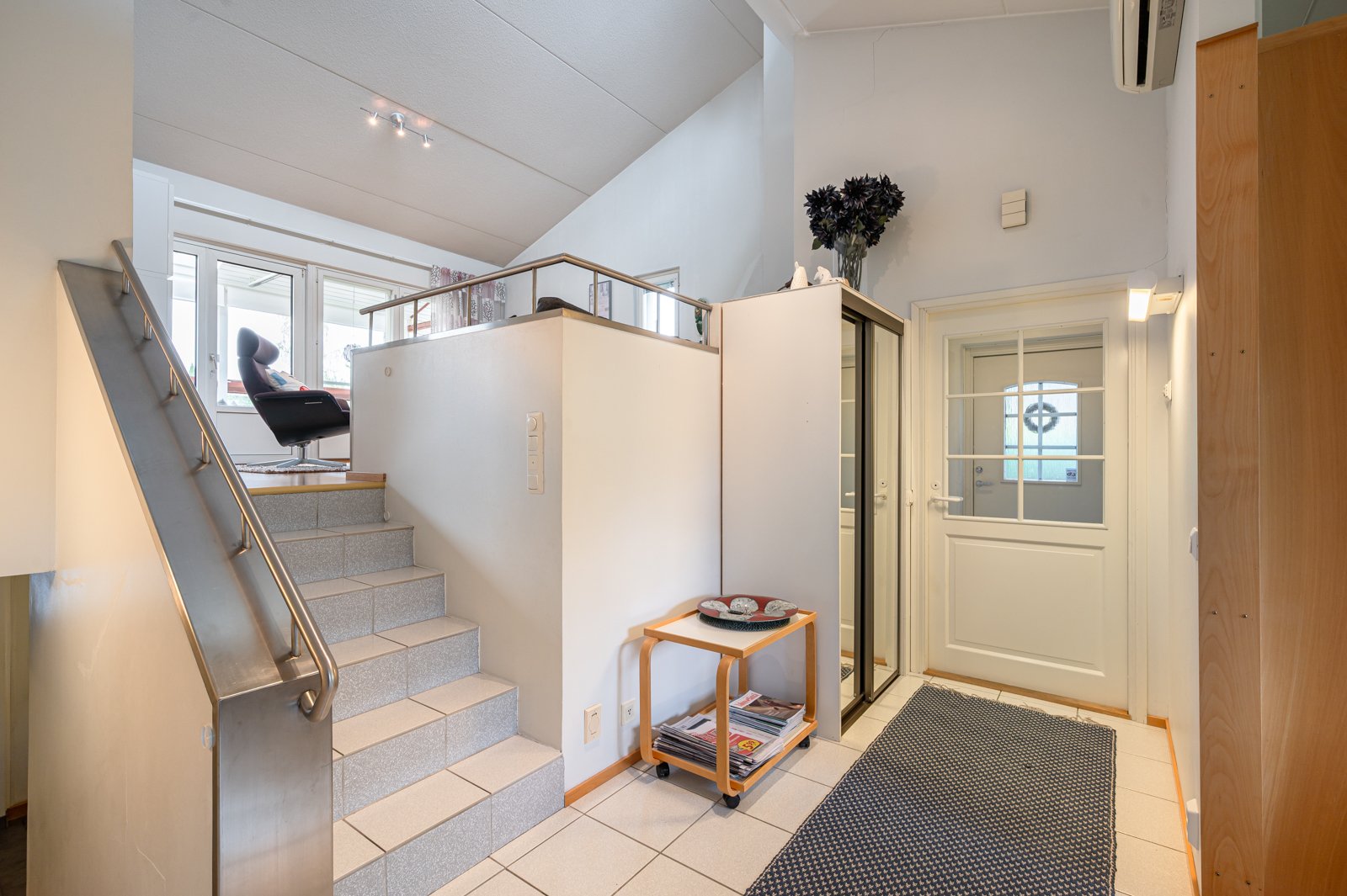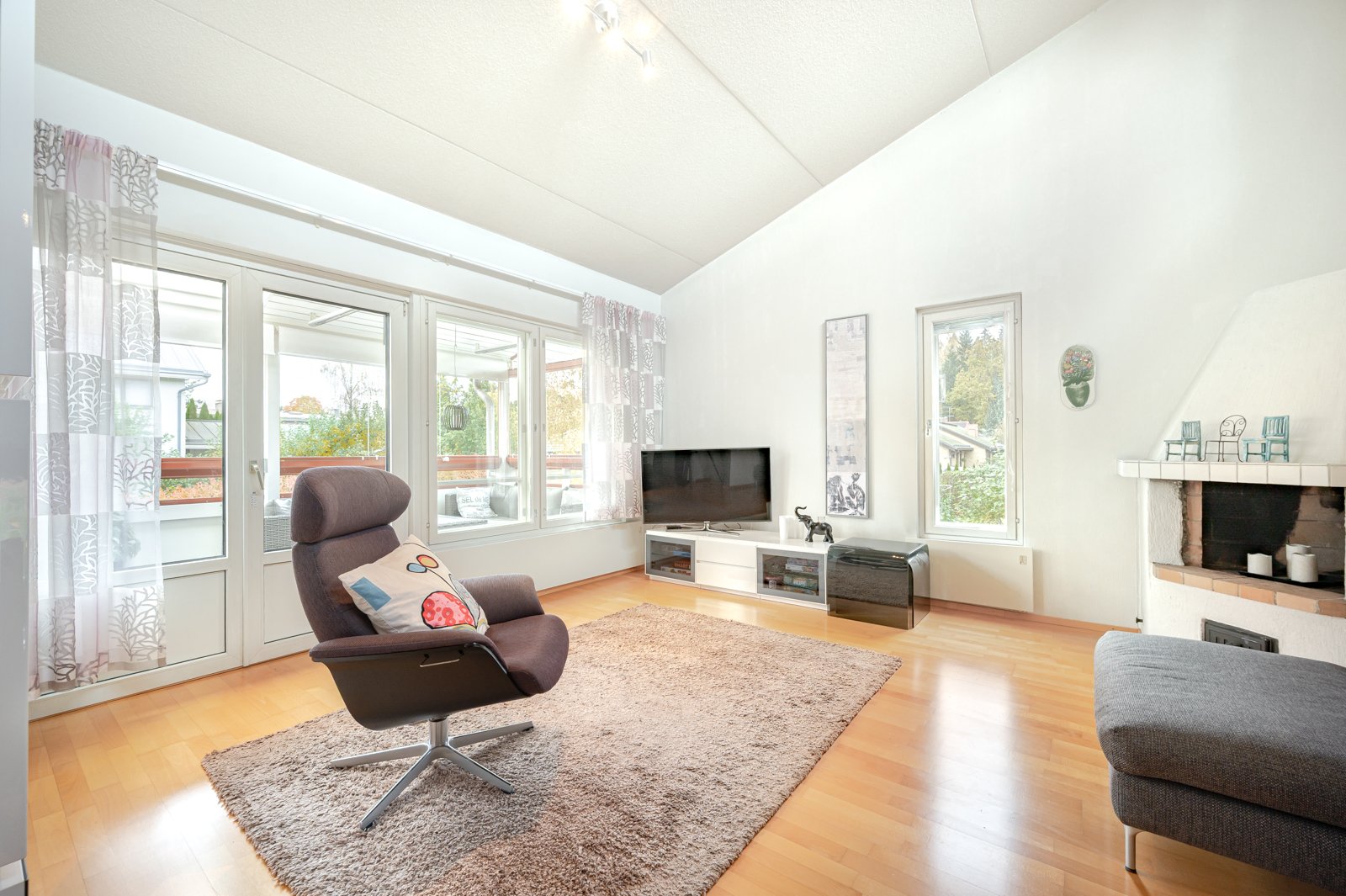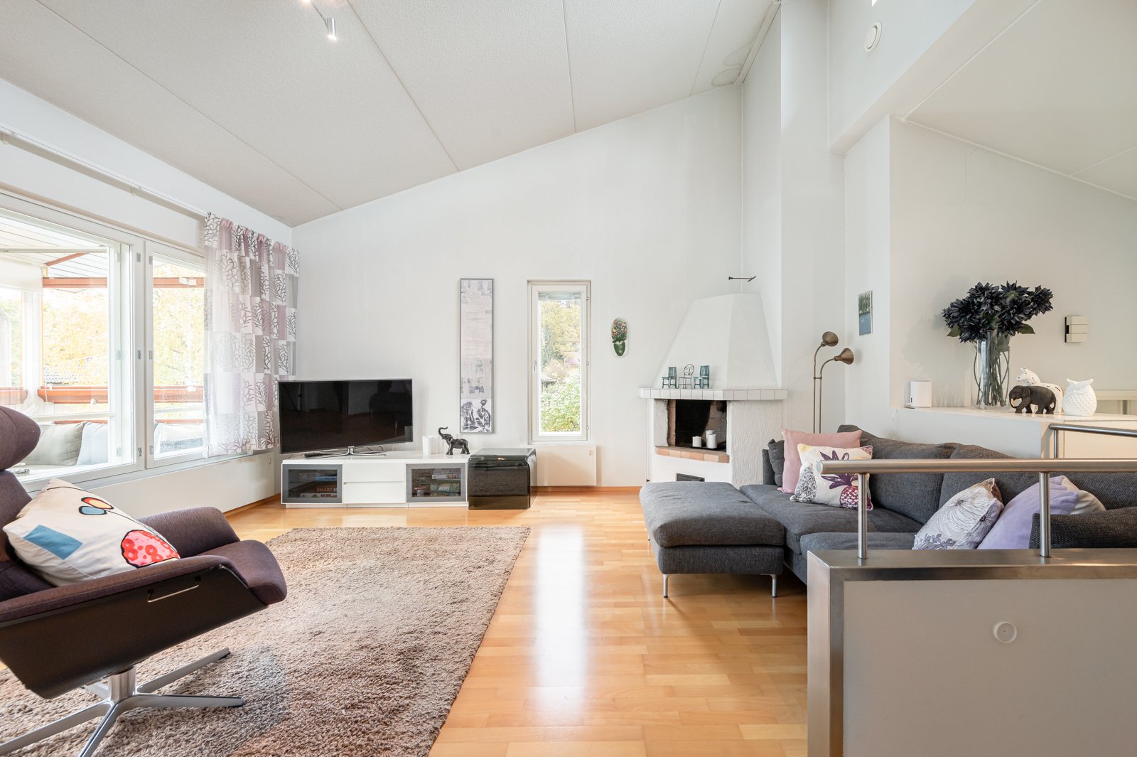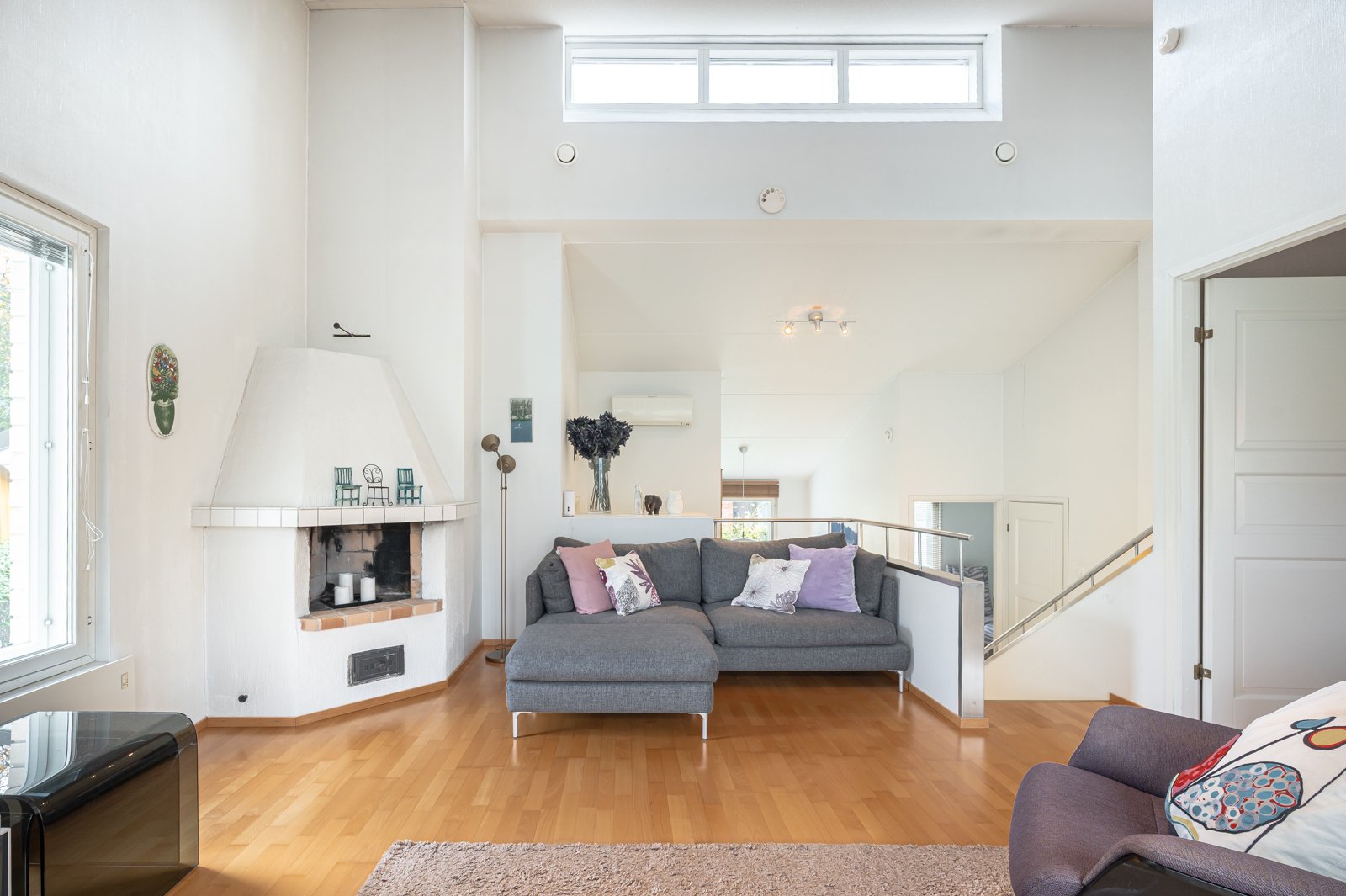 Huoneet sijoittuvat kolmeen tasoon toimivaksi kokonaisuudeksi. Olohuone sijaitsee ylimmällä tasolla, josta on käynti suurelle lasitetulle parvekkeelle ja isoon makuuhuoneeseen, jonka yhteydessä on tilava vaatehuone. Olohuoneessa on suuret ikkunat ja paljon avaraa tilaa sekä takka tunnelman luojana.