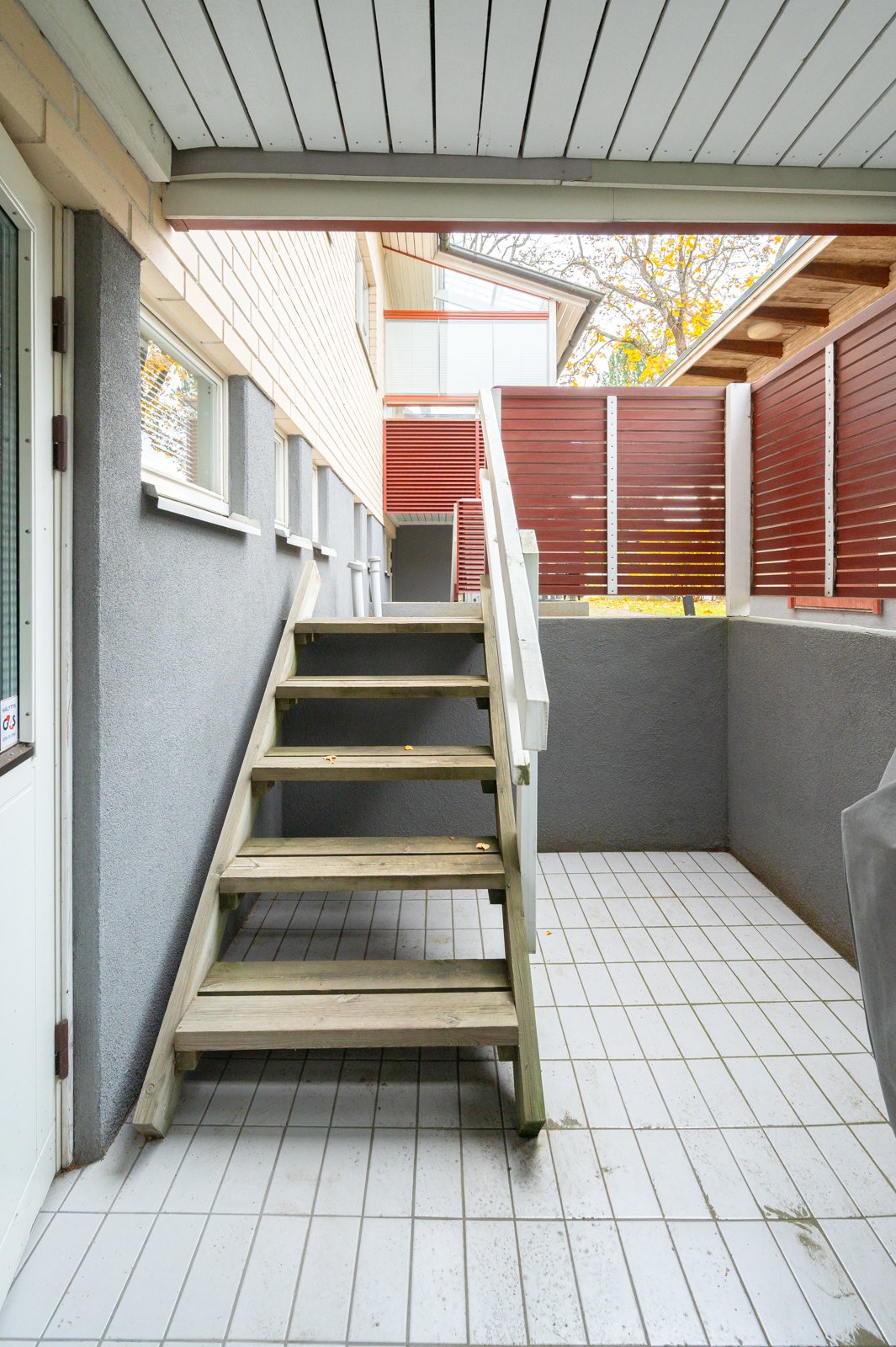 Alakerran aulassa laattalattia, vesieristys, lämminvesivaraaja 390 L, vaatekaappi, käynti ulos katettuun tilaan, jossa ulkovarasto ja portaat pihalle.