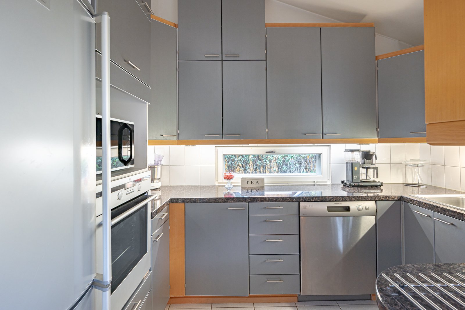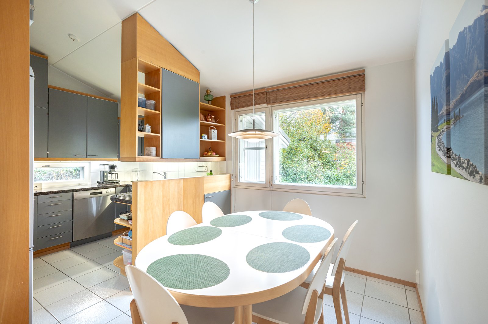 Puustelli keittiö, paljon säilytystilaa, kivitasot. AEG 2008 täyskorkea jääkaappi ja pakastin (alaosassa vierekkäin 2xpakastin, yläosassa jääkaappi + viileäkaappi). AEG 2008 keraaminen liesi ja kalustekiertoilmauuni. Cylinda astianpesukone, Samsung mikroaaltouuni, liesituuletin. Franke tiskipöytä ja teräsaltaat 2 kpl. Lattialämmitys.