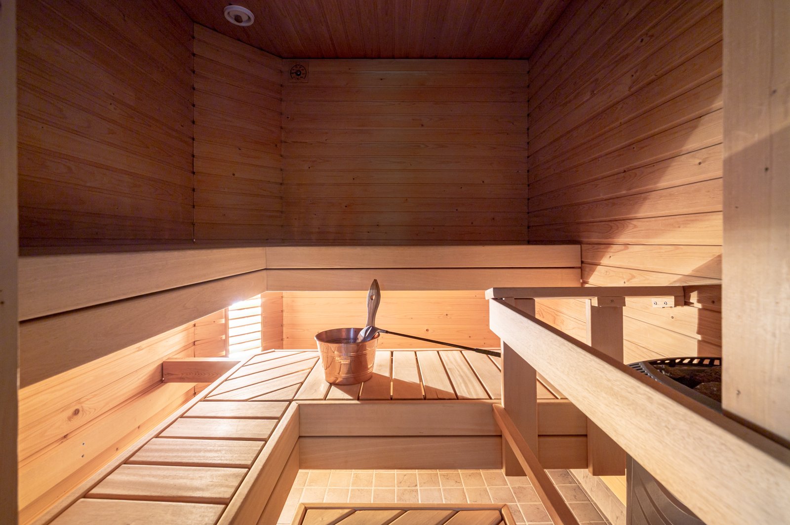 Seinät ja lauteet paneelia, Harvian sähkökiuas. Lasiovi pesuhuoneeseen.