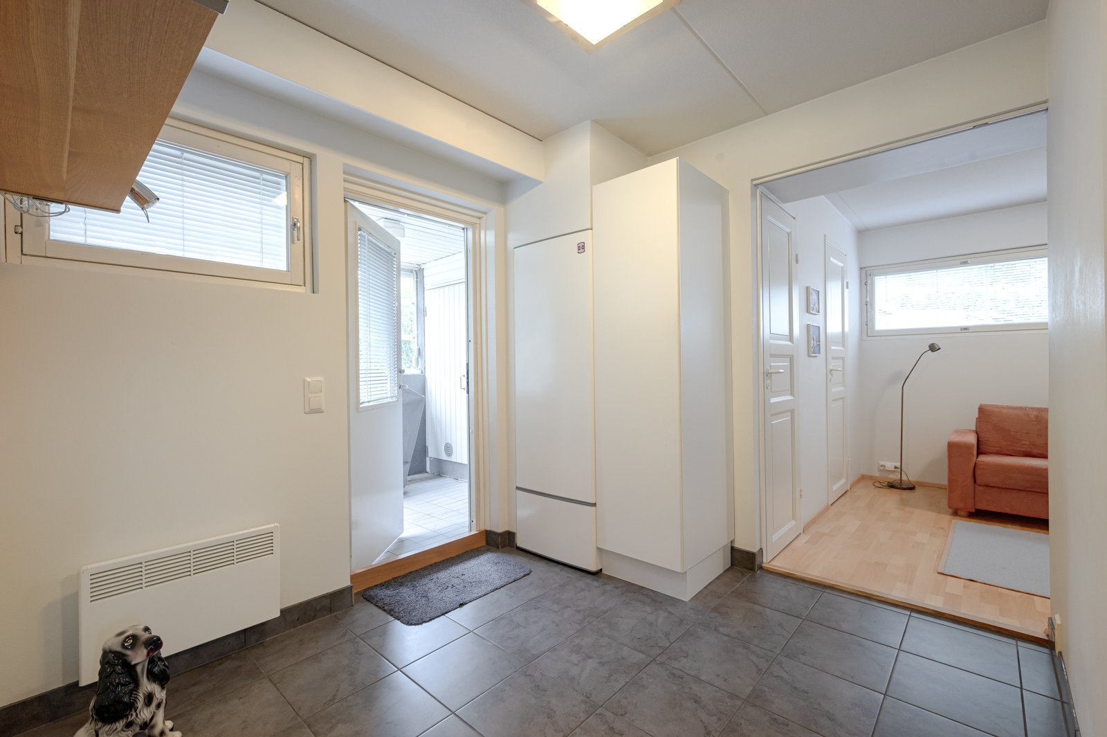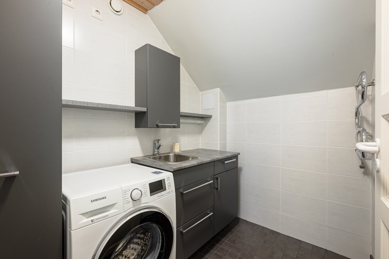 Hyvin varustettu kodinhoitohuone alakerrassa, josta käynti pihalle. Samsung pyykinpesukone. Paljon kaappitilaa ja tilava työskentelytaso. Laattalattia, lattialämmitys, kuivauspatteri. Vesieristetty lattia, myös ala-aulassa.