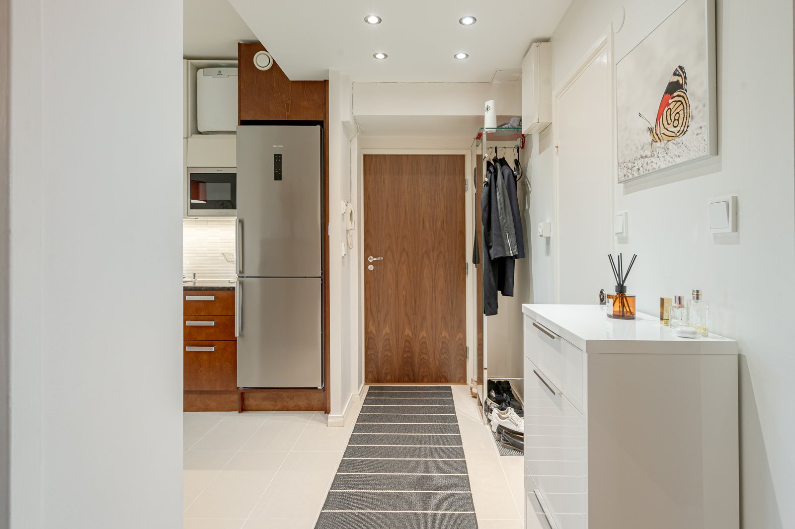 Pyykin pesukone, mikroaaltouuni, ilmanpuhdistin, eteisen kiinteä peilillinen naulakko.