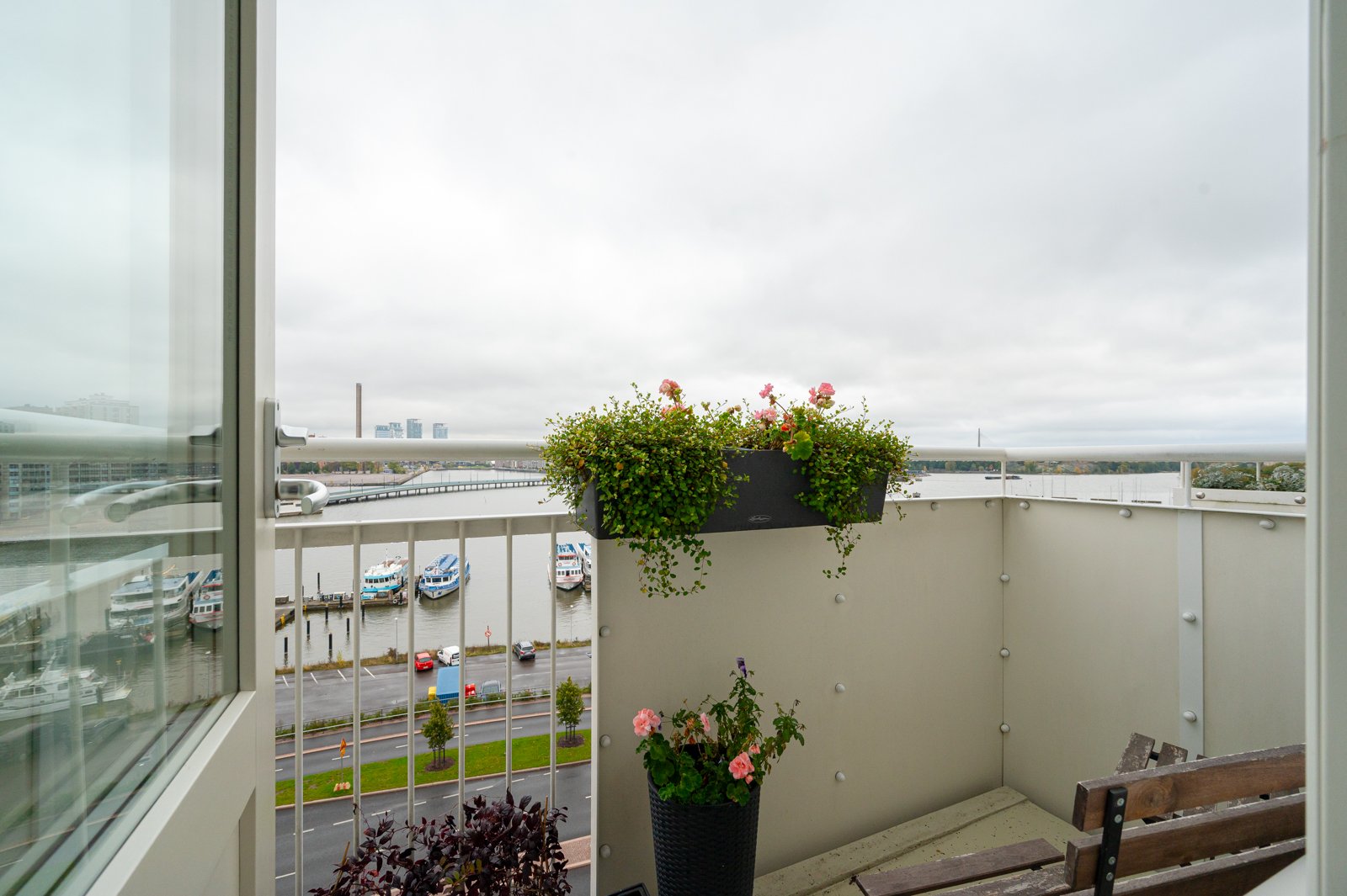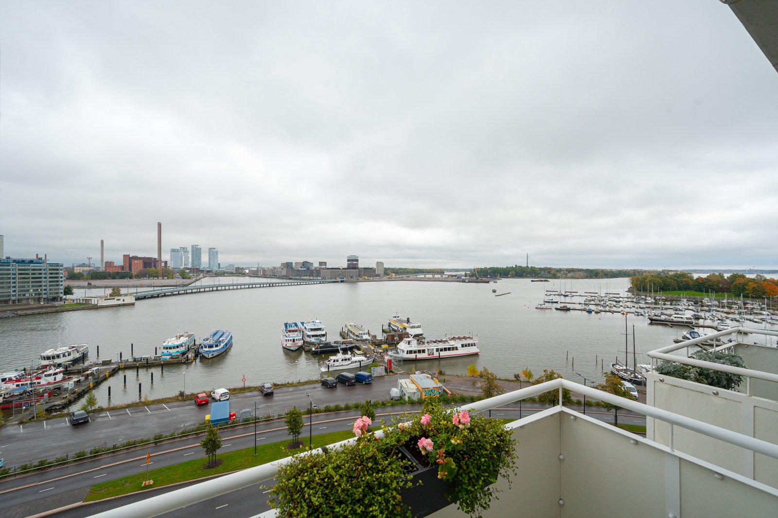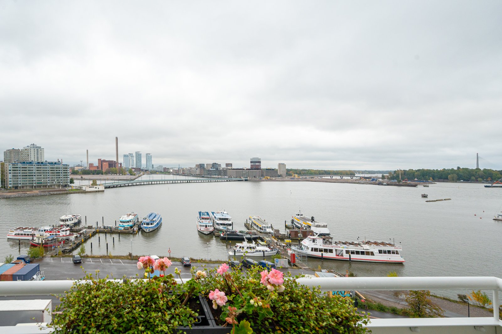 Nämä näkymät omalta parvekkeelta, olohuoneesta, makuuhuoneesta, keittiöstä. Merta, laivoja, uudistuvaa kaupunkia, puita, kattoja, kaunista Helsinkiä yöllä ja päivällä.