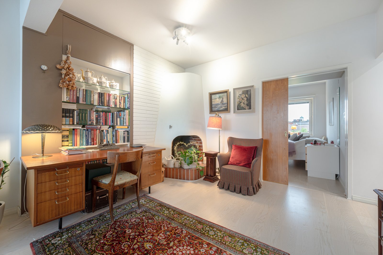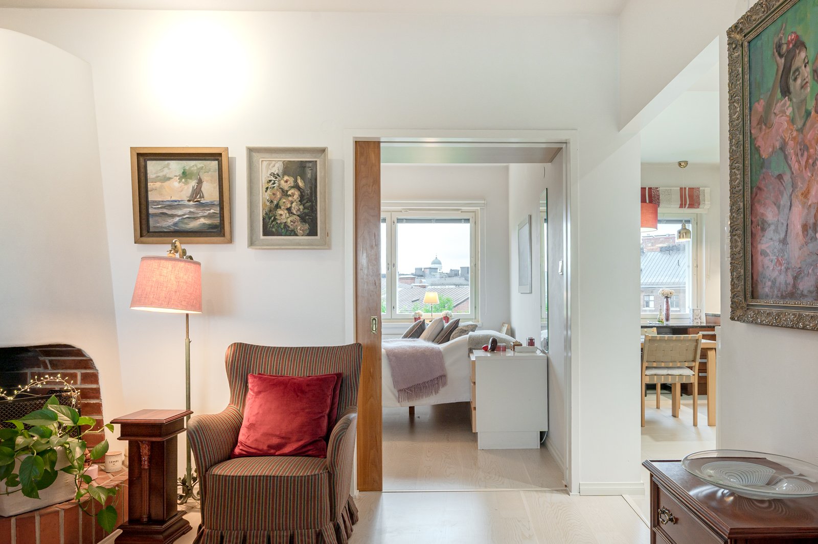Ylin 8/8 kerros, hissi, läpitalon kaksio, oma parveke, merinäköala, vihreä sisäpiha, takka, sähköauton lataus pihalla vapaasti käytettävissä.