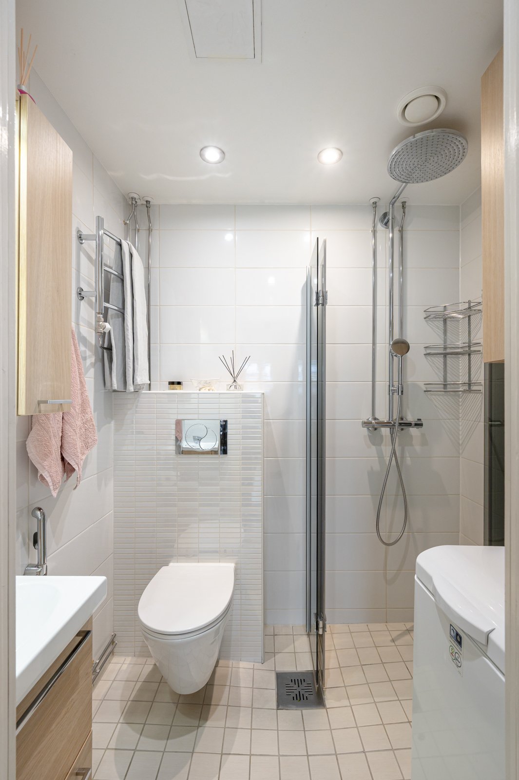 Seinillä valkoiset kaakelit, laatta lattia, lattialämmitys (sähkö) termostaattisäädöin. Seinä wc, suihku, kompaktisti taittuvat suihkukaapinovet, peili- ja allaskaappi. Pesukoneliitäntä,