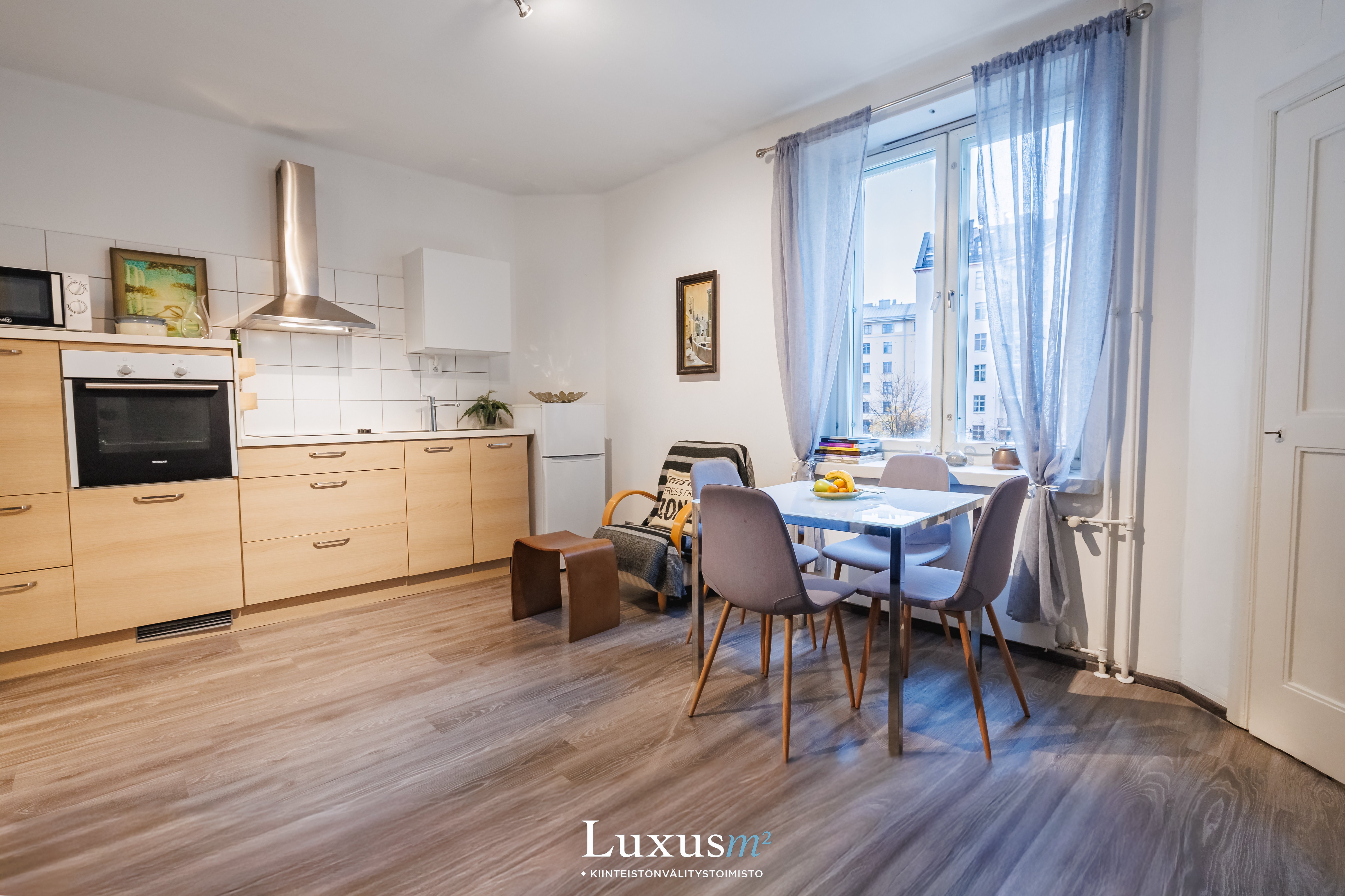 Varustus: Jääkaappipakastin, uuni, liesi, liesituuletin, mikroaaltouuni.